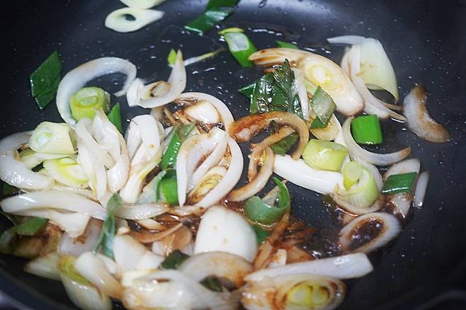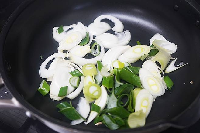 팬을 센 불에 충분히 예열한 뒤, 양파와 대파를 먼저 넣고 2~3분 정도 마른 팬에서 볶아줍니다.
