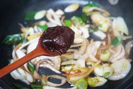 고추장 1스푼, 고춧가루 3스푼을 넣고 천천히 볶아주세요.