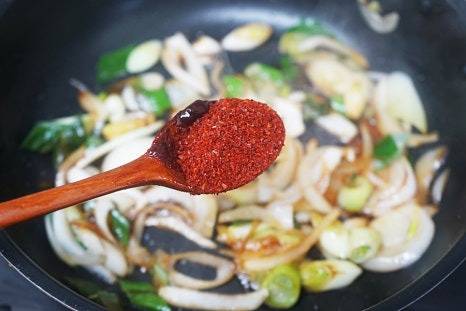 고추기름이 배어나오도록 살살 볶는 것이 포인트예요.