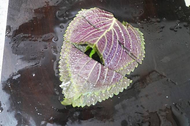 마지막으로 깻잎은 5~6장 정도 기호에 맞게 채 썰어 준비합니다.
