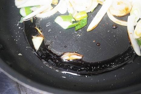 재료를 한쪽으로 밀어두고, 빈 공간에 진간장 4스푼을 넣어 바글바글 끓여줍니다.