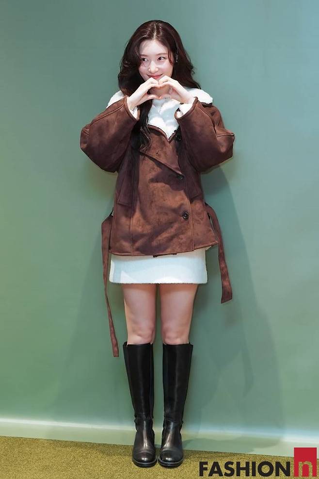 이날 정채연은 굵은 웨이브 롱 헤어에 무스탕 재킷과 화이트 원피스를 믹스매치해 사랑스라운 겨울 겨울 여친룩을 완성했다.