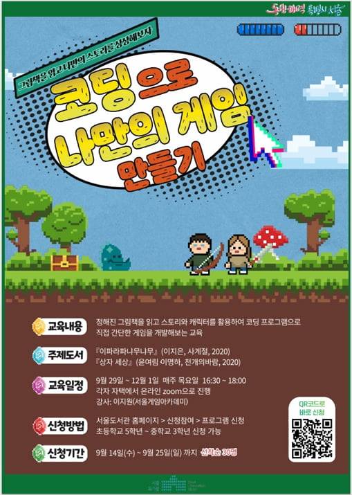초등학교 5학년부터 중학교 3학년을 대상으로 매주 목요일 10회에 걸쳐 그림책을 활용하여 수강생이 직접 코딩으로 게임 프로그램을 만들어보는 강좌를 온라인으로 운영할 계획이다. 평소 코딩과 게임에 관심 있는 어린이와 청소년을 대상으로 자신만의 창작물을 만들어 볼 수 있는 기회가 될 것으로 보인다.