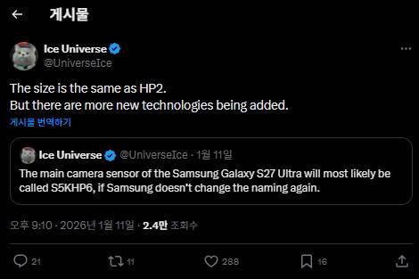 유명 IT 팁스터인 Ice Universe에 따르면, 갤럭시 S27 울트라는 기존 S26 울트라와 비교해 메인 카메라, 전면 카메라, 초광각 카메라까지 전반적인 업그레이드가 이뤄질 가능성이 크다고 합니다. 특히 눈에 띄는 부분은 메인 카메라 센서입니다.