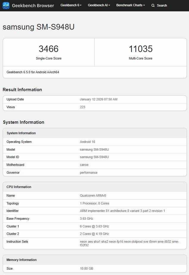 이번에 확인된 모델은 모델명 SM-S948U로, 미국 시장용 삼성 갤럭시 S26 울트라입니다. RAM은 12GB, 운영체제는 Android 16으로 확인됐습니다. 다만 이번 테스트에서는 프로세서가 최대 클럭으로 동작하지 않았다고 해요. 6개의 코어는 3.63GHz, 고성능 코어 2개는 4.19GHz로 제한된 상태였는데요. 그럼에도 불구하고 싱글코어 점수는 3,466점, 멀티코어 점수는 11,035점을 기록했습니다.