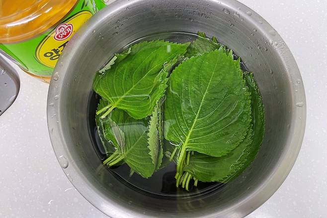 먼저 식초 약간 푼 물에 깻잎을 5분 정도 담가 잔류농약을 제거해 줍니다.
