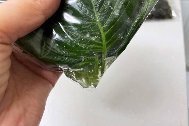 이때 깻잎에서 물기가 나와 아래쪽에 모이는 게 보이실 거예요. 이 물기에 깻잎의 줄기 부분이 닿게 해 주면 깻잎이 물기를 흡수해 싱싱해요.