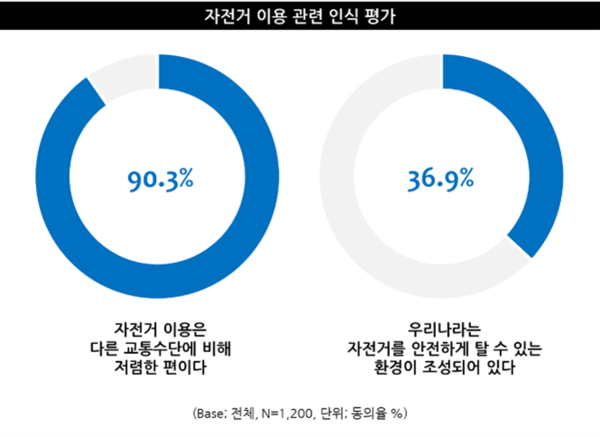 한편, 전체 응답자의 대다수(90.3%)가 자전거 이용은 다른 교통수단이 비해 저렴한 편이라고 평가할 정도로 경제적이고 효율적인 이동 수단으로 여겨지고 있는 모습을 확인할 수 있었다.