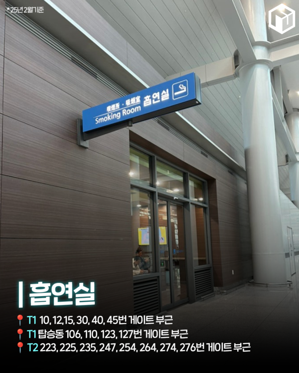 ✅ 흡연실▪︎ T1 10, 12,15, 30, 40, 45번 게이트 부근▪︎ T1 탑승동 106, 110, 123, 127번 게이트 부근▪︎ T2 223, 225, 235, 247, 254, 264, 274, 276번 게이트 부근
