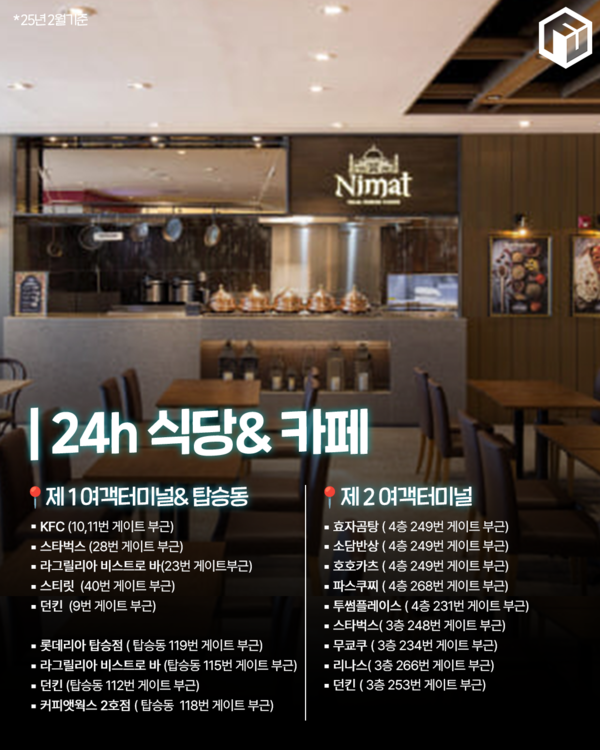 늦은 저녁과 새벽 비행 전 공항 노숙시 이용할 수 있는 24시간 식당과 카페입니다. 식사가 가능과 카페가 있으니 참고해 이용해 보시길 바랍니다.