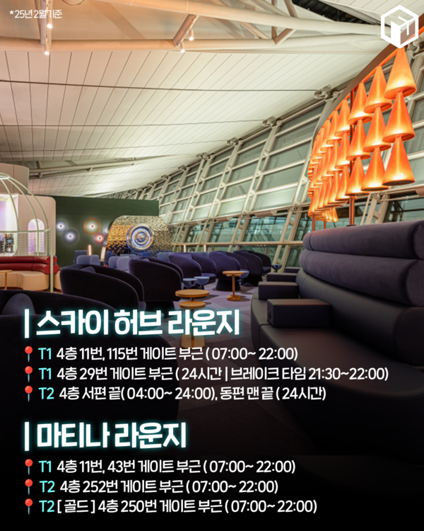 ✅ 마티나 라운지▪︎ T1 4층 11번, 43번 게이트 부근 ( 07:00~ 22:00)▪︎ T2 4층 252번 게이트 부근 ( 07:00~ 22:00)▪︎ T2 [ 골드 ] 4층 250번 게이트 부근 ( 07:00~ 22:00)