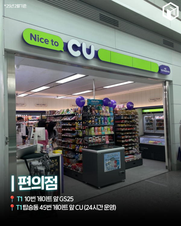 ✅ 편의점▪︎ T1 10번 게이트 앞 GS25▪︎ T1 탑승동 45번 게이트 앞 CU (24시간 운영)