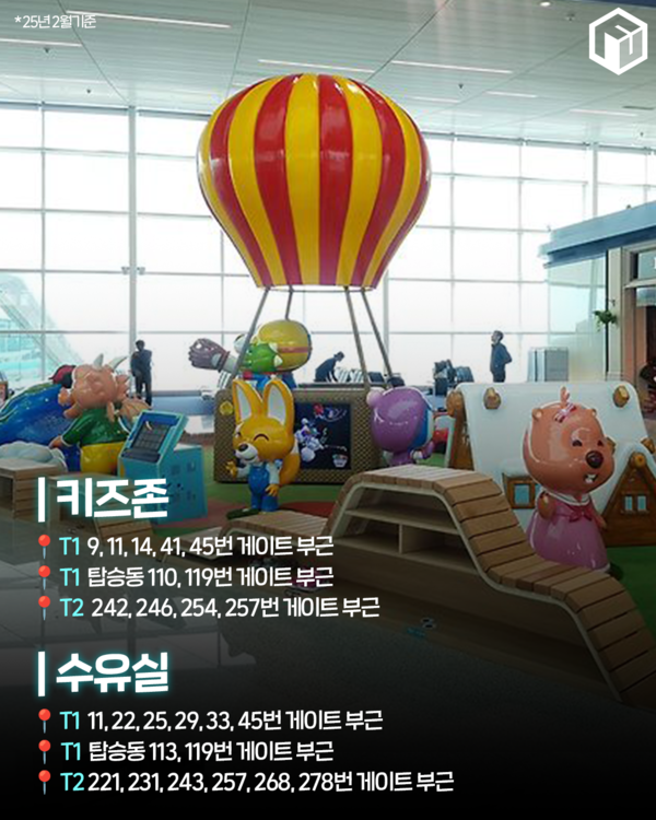 ✅ 키즈존▪︎ T1 9, 11, 14, 41, 45번 게이트 부근 ▪︎ T1 탑승동 110, 119번 게이트 부근 ▪︎ T2 242, 246, 254, 257번 게이트 부근