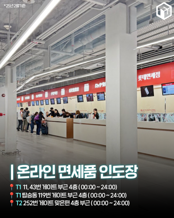 온라인 면세시 면세품을 인도받을 수 있는 온라인 면세품 인도장은 1터미널, 탑승동, 2터미널에 모두 위치해있으며 24시간 운영을 하니 면세품 인도 위치를 잘 확인해 보시고 방문하시길 추천립니다.