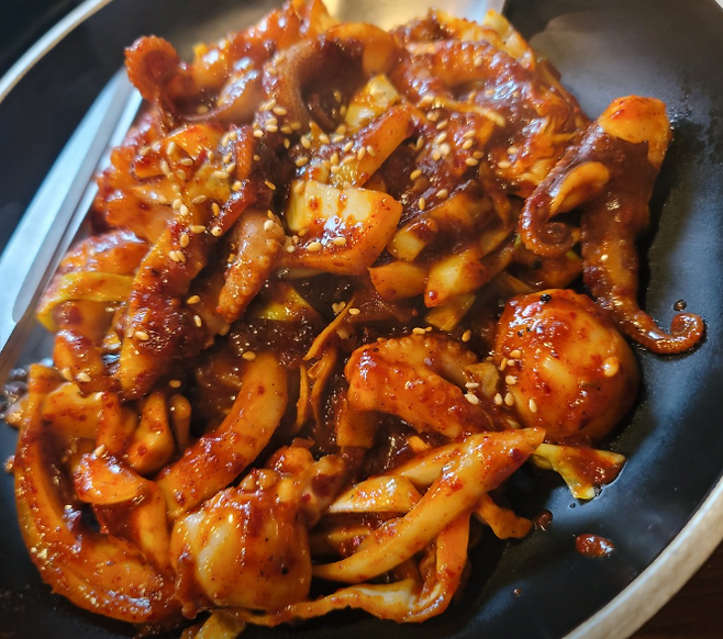 철판쭈삼 (쭈꾸미+삼겹살 볶음)쫄깃한 쭈꾸미에 고소한 삼겹살 조합, 밥이 안 비벼질 수 없죠?