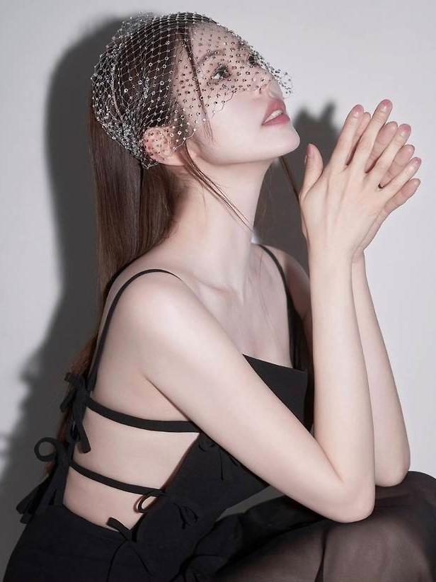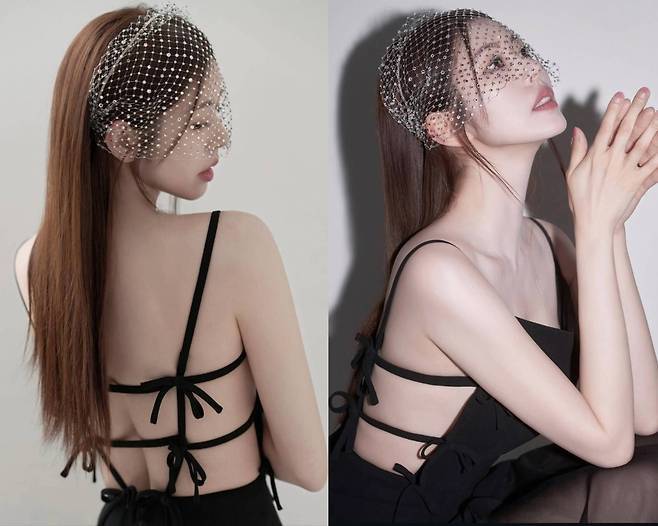 여기에 진주를 촘촘히 엮은 망사 베일을 더해 마치 고전 영화 속 디바를 연상케 하는 분위기를 완성했으며, 한 올 흐트러짐 없는 긴 생머리는 우아함을 극대화시켰습니다.