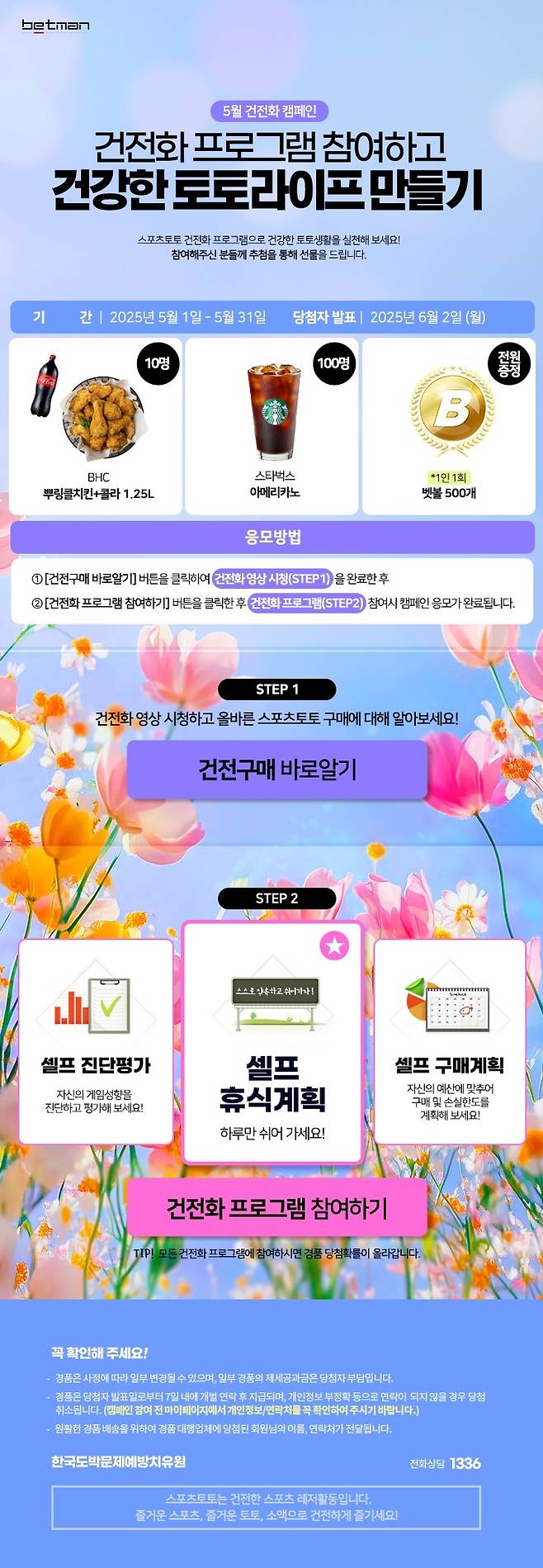 국민체육진흥공단이 발행하는 체육진흥투표권 스포츠토토의 공식 인터넷 발매사이트 베트맨이 2025년 5월 건전화 캠페인인 ‘건전화 프로그램 참여하고 건강한 토토라이프 만들기’ 이벤트를 오는 31일(토)까지 진행한다고 밝혔다.