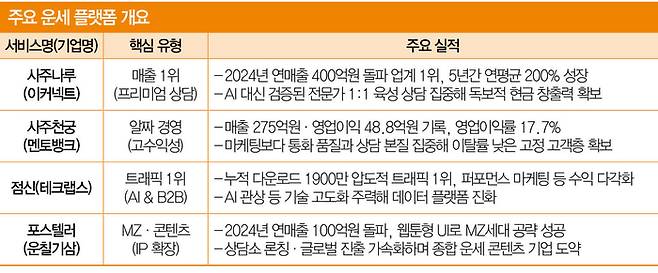 이런 흐름을 타고 등장한 운세 플랫폼 기업들은 각기 다른 전략으로 시장을 장악하고 있다. 크게 상담 연결형, AI·데이터 기반형, 콘텐츠형으로 나뉘며, 최근에는 이 경계를 허무는 ‘슈퍼앱’ 경쟁이 치열하다.