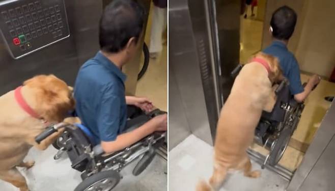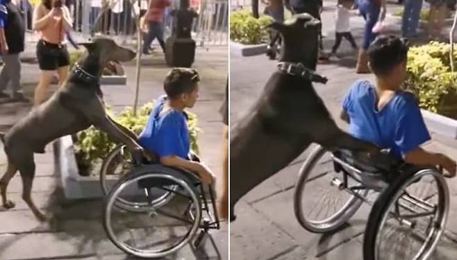 휠체어를 탄 한 남성의 뒤에서, 작은 강아지 한 마리가 코끝으로 열심히 휠체어를 밀어주고 있는 것이었다.