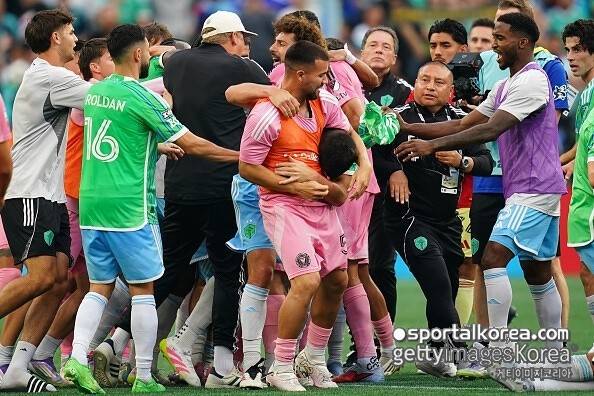 마이애미의 진짜 문제는 경기 후에 벌어졌다. 수아레스는 상대 미드필더 오베드 바르가스의 목덜미를 쥐며 조르는 듯한 행동을 가했고, 순식간에 양 팀 선수들의 몸싸움이 발발했다.