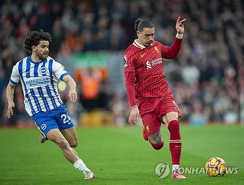 epa11697422 Fred Kad?oglu of Brighton (L) and Darwin Nunez of Liverpool in action during the English Premier League soccer match between Liverpool FC and Brighton & Hove Albion, in Newcastle, Britain, 02 November 2024. EPA/PETER POWELL EDITORIAL USE ONLY. No use with unauthorized audio, video, data, fixture lists, club/league logos, 'live' services or NFTs. Online in-match use limited to 120 images, no video emulation. No use in betting, games or single club/league/player publications.