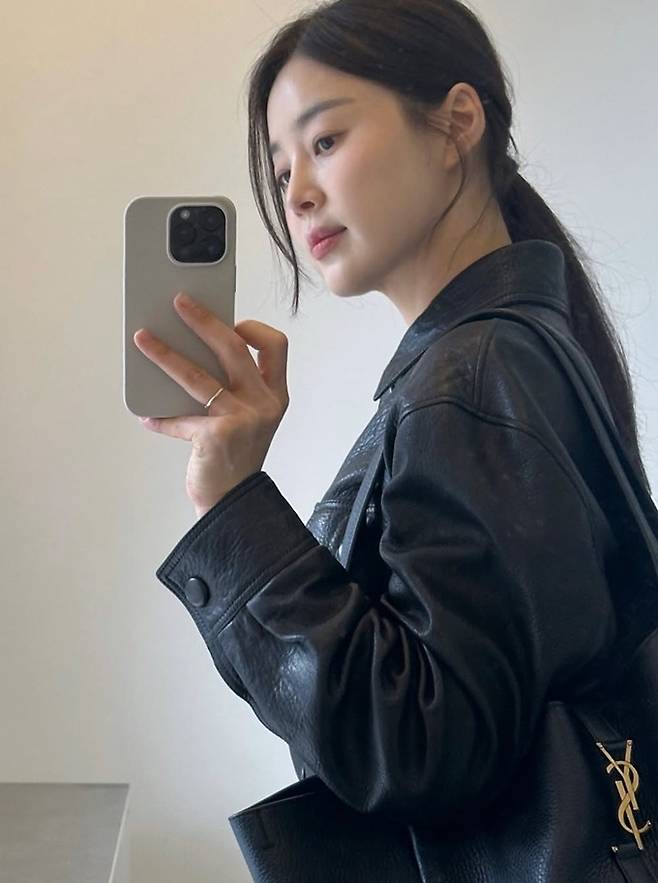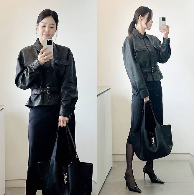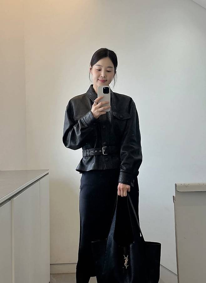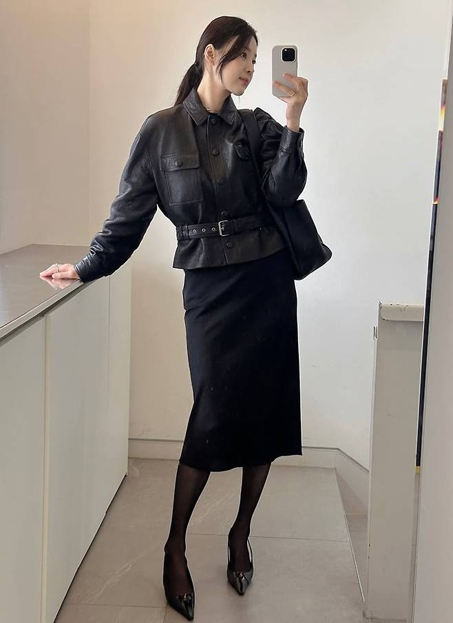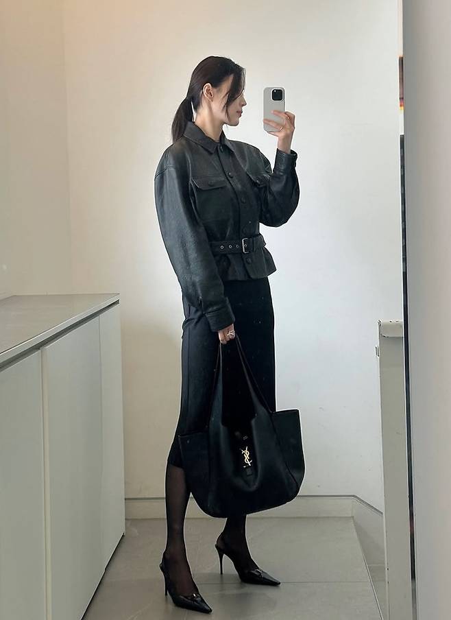 공개한 사진에서 한지혜는 허리 벨트로 실루엣을 강조한 블랙 레더 재킷에 7부 길이의 H라인 블랙 스커트를 매치한 올 블랙 출근룩으로 슬림하면서도 단정한 스타일을 연출했다.