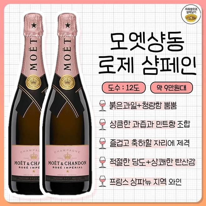 로제와인은 적포도를 짧은 시간 동안만 발효시켜 연한 분홍빛을 띠며, 레드와인과 화이트와인의 중간적인 맛을 가집니다.