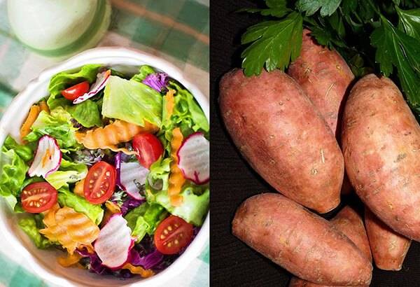 샐러드는 평소에는 건강에 좋은 메뉴다. 하지만 러닝 전이라면 샐러드는 피하는 게 좋다. 신선한 생채소는 건강을 기할 수 있는 먹거리지만, 러닝 전에 먹게 되면 복부팽만을 유발할 수도 있다. 고구마는 껍질을 벗겨서 삶아 먹으면 러닝에 좋지만, 껍질째 먹는 건 러닝 전에 피해야 한다. 껍질을 먹게 되면 식이섬유를 다량 섭취하게 되는데, 이것이 장 운동을 촉진해서 러닝 중에 변의를 부를 수 있기 때문이다.