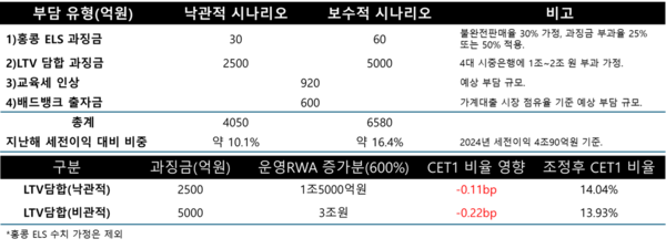 ELS와 LTV 과징금 관련 부담금액이 최소 2530억원에서 최대 5060억원인 점을 고려하면 우리은행의 운영RWA가 1조5180억~3조360억원 증가한다. 우리은행의 2분기 기준 RWA는 186조358억원, CET1 비율은 14.15%이다. 운영RWA 증가를 반영한 CET1 비율은 13.92%~14.04%로 0.11~0.23bp(bp=0.01%p) 하락하는 결과를 초래한다.