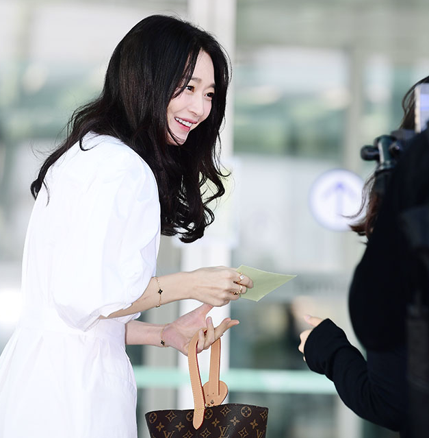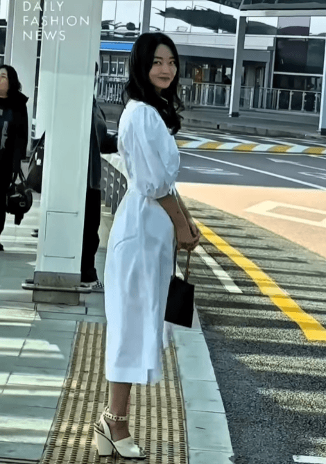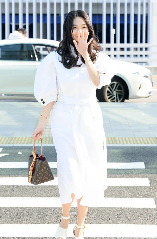 깔끔하고 우아한 디자인의 원피스는 그녀의 날씬한 몸매를 더욱 돋보이게 했습니다. 여기에 고급스러운 루이비통 가방을 매치함으로써 세련된 공항 패션을 완성했는데요💕