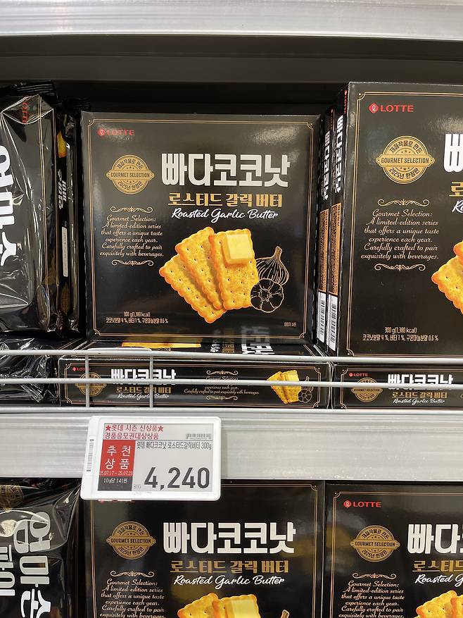 롯데의 빠다코코낫 로스티드 갈릭 버터는 과자 형태의 스낵으로, 고소한 버터와 구운 마늘의 풍미가 조화를 이루는 제품이에요.