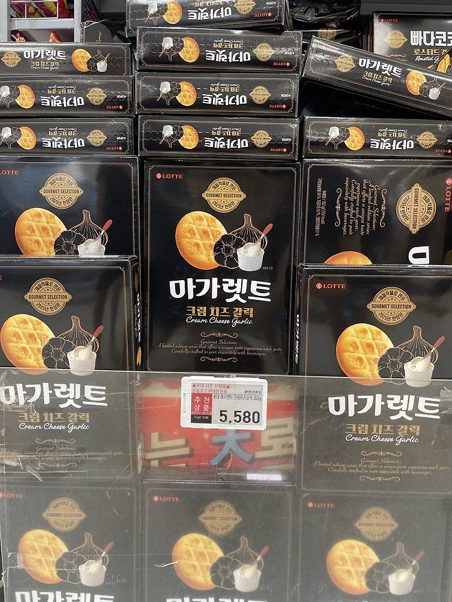 롯데의 마가렛트 크림 치즈 갈릭은 부드러운 크림 치즈와 고소한 버터, 그리고 은은한 마늘 향이 어우러진 쿠키형 과자에요.