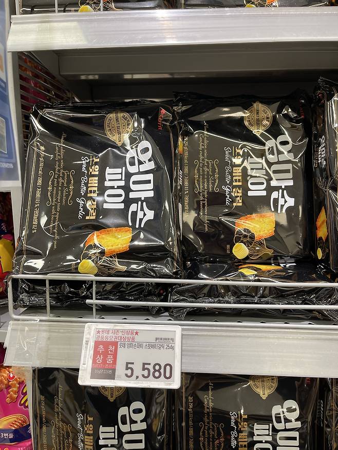 롯데의 엄마손 파이 스윗 버터 갈릭은 마늘과 버터의 풍미가 조화를 이루는 과자로, 마늘 바게트의 부드럽고 고소한 맛을 재현한 제품이에요.