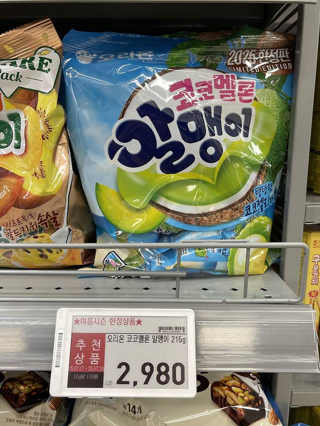 오리온의 코코멜론 알맹이는 상큼한 멜론 맛을 담은 젤리 스낵으로, 여름 시즌 한정판으로 출시되었어요.