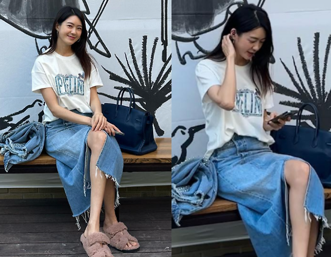 이요원은 화이트 프린팅 반팔 티셔츠와 청치마를 매치해 캐주얼룩을 선보였습니다. 앞트임 디자인의 청치마는 활동성을 고려한 스타일로, 슬리퍼와 퍼디테일로 귀여운 포인트를 더하며, 캐주얼하면서도 사랑스러운 매력을 발산했습니다.