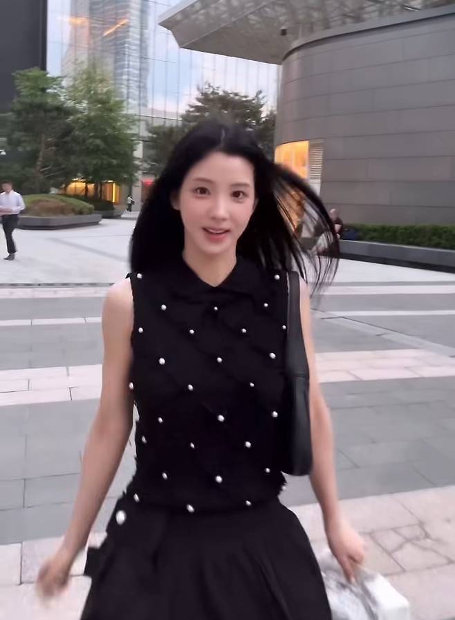 상의는 올오버 진주 디테일이 더해진 민소매 블라우스로, 자칫 단조로울 수 있는 블랙에 입체감을 더했고, 하의는 큐롯 스타일의 미니 스커트로 활동성과 스타일을 모두 잡았습니다.