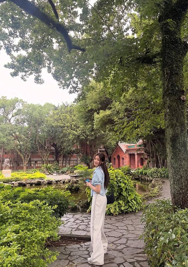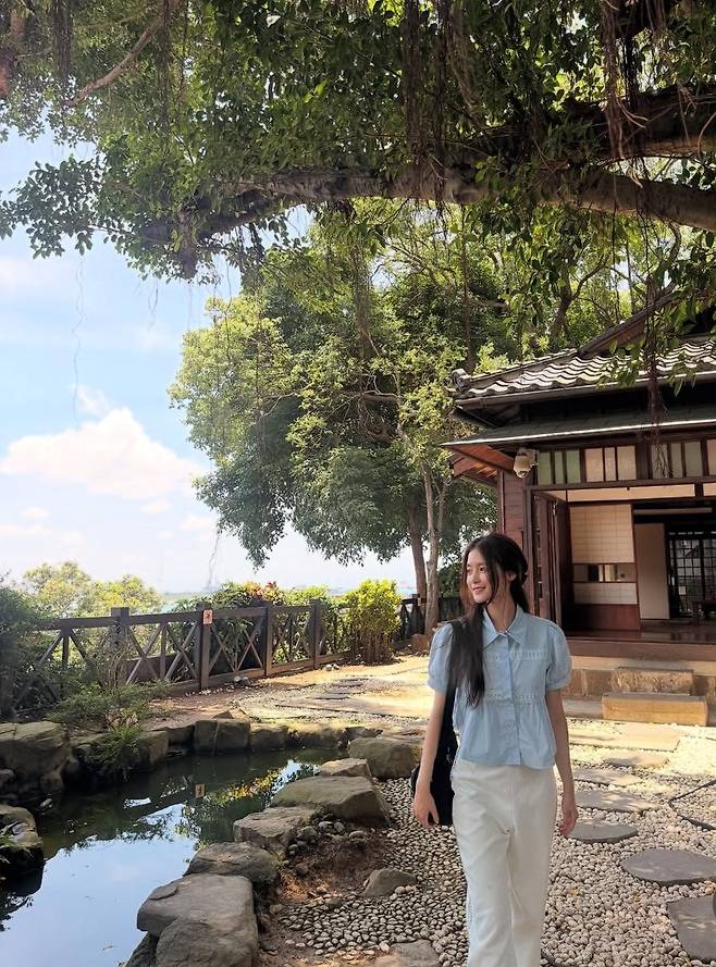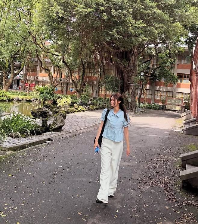 하늘색 셔츠에 와이드 팬츠를 매치해 여유로운 실루엣을 연출했으며, 사이드 라인 디테일이 더해진 팬츠로 캐주얼한 멋을 살렸습니다.