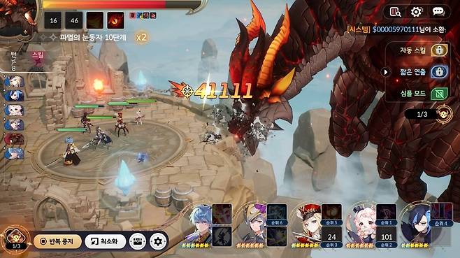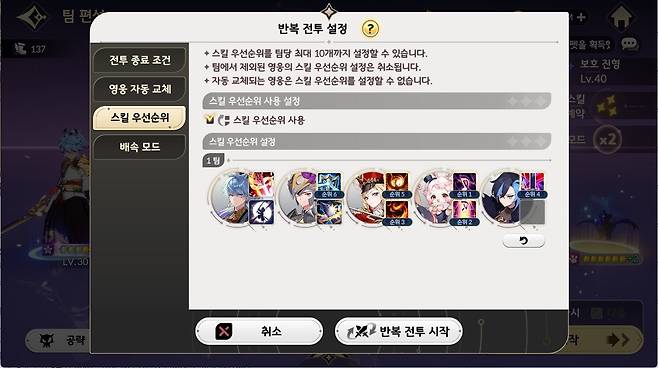반복 전투 스킬 예약 순서와 최소 딜견적은?유이의 부활, 회복 1, 2순위! 레이첼의 디버프도 이용하자 세인의 귀신 베기로 3만 이상의 딜을 낼 수 있다면, 파멸의 눈동자 10단계는 클리어가 가능하다. 기본적으로 스킬 우선순위 1순위와 2순위는 모두 유이의 스킬이다. 아군 부활 스킬인 '축복의 선율'을 1순위로 두는 이유는 해당 스킬을 최우선으로 사용하되, 사망한 아군이 없을 경우엔 나머지 스킬을 사용하는 메커니즘을 지녔기 때문이다.