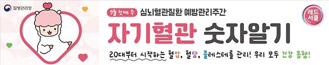 질병관리청(청장 지영미)은 9월 1일부터 7일까지 ‘심뇌혈관질환 예방관리주간’을 맞아 「자기혈관 숫자 알기 - 레드서클 캠페인」을 실시한다고 밝혔다.