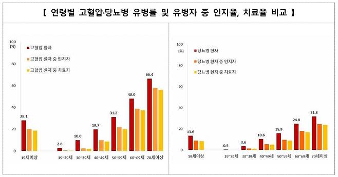 예를 들어, 70세 이상에서는 본인이 고혈압이라는 사실을 알고 있는 경우가 87.1%로 나왔다. 그러나 40대 고혈압 환자는 약 50%, 30대 고혈압 환자는 약 25% 정도만이 본인이 고혈압이라는 것을 자각하고 있었다. 실제 통계상 30대 성인 100명 중 10명이 고혈압이지만, 그 중 7~8명은 본인이 그 사실을 모르고 있다는 것이다.