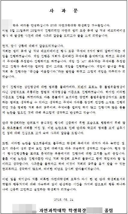 대학 자연과학대학 학생회 측은 24일 새벽 사과문을 게재했다. 학생회 측은 공식적인 행사에서 신중치 못한 행동을 보인 데 대해 사과하면서도 문제가 된 ‘국산 야동’은 합법적인 영상을 의미한다고 해명했다.