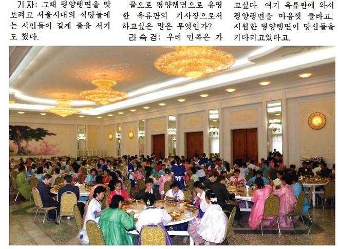 라 기사장은 그러면서 "옥류관은 전통적인 평양냉면의 고유한 맛과 향취를 더 잘 살리기 위해 탐구와 실험을 거듭하면서 그 조리법을 과학적 토대위에 올려세우기 위해 많은 노력을 기울여왔다"고 강조했다.