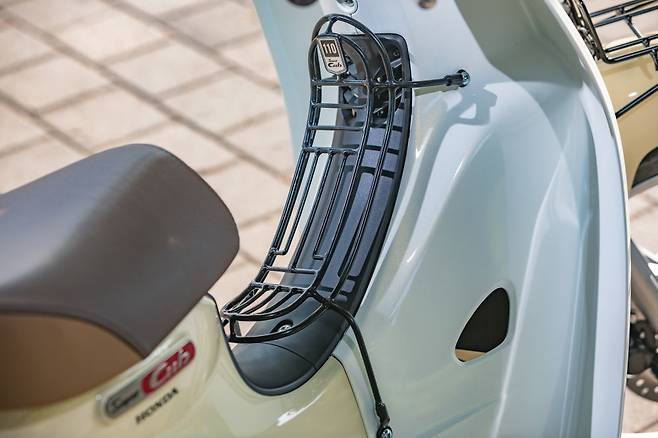 2018 슈퍼커브의 레트로한 첫인상이 마음에 든다. 클래식 한 원형 헤드라이트와 헤드라이트 커버는 과거 슈퍼커브 시리즈를 관통하는 디자인 그대로를 닮았다. 싱글 시트 아래를 지나가는 차체 하단의 모양새에서도 1958년 오리지널 커브인 C100의 분위기가 풍긴다. 시트 바로 아래 커브 로고마저도 옛것 그대로다. 바로 전작의 커브가 현대적인 디자인을 강조했던 것과는 달리 클래식한 분위기로 돌아간 것이 마음에 든다. 최근 몇 년 동안 지속 되고 있는 트렌드인 클래식 분위기에도 잘 맞는다.
