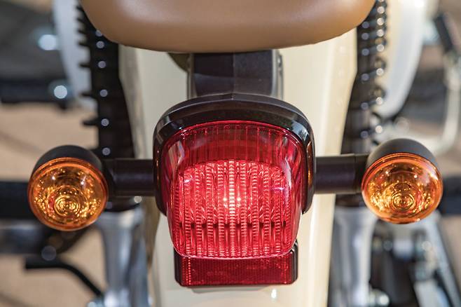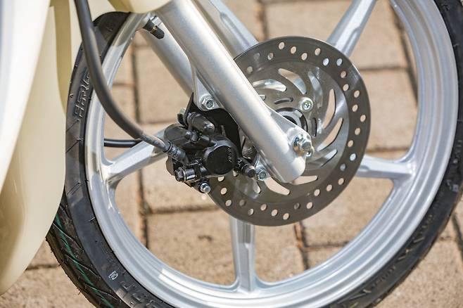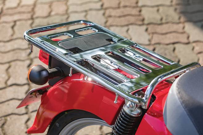 두 번째로는 리어 서스펜션. 대형 캐리어를 장비한 만큼 적재 화물량을 고려했다. 프리 로드가 조절되는 타입은 아니지만 움직임이 상당히 만족스럽고 동승자와 함께 탔을 때에도 잘 받쳐주는 느낌이다. 세 번째로는 브레이크고 마지막은 알루미늄 캐스트 휠이다. 제동성능에 대한 요구에 맞춰 프런트에 유압식 디스크 브레이크를 장착해 브레이크 성능 확보를 꾀했고 알루미늄 캐스트 튜브리스 휠을 장착한다. 기본인 스포크 휠에 비해 클래식한 분위기가 감소되지만 아무래도 튜브를 사용하지 않아 타이어 유지 보수에 큰 장점이 있다.