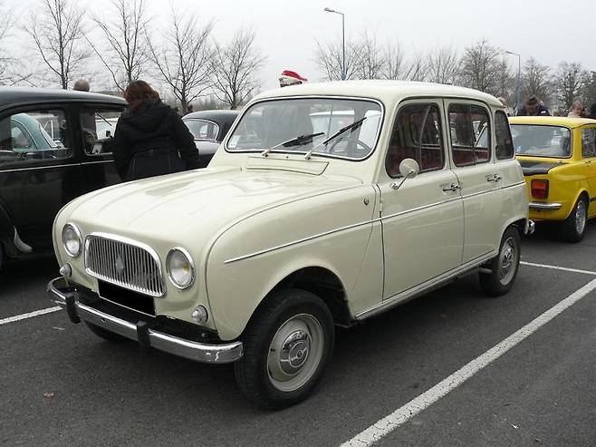르노 4는 르노 역사상 가장 유명한 모델 중 하나다. 비대칭이 한눈에 들어오지 않는다면 바퀴 쪽을 보면 알 수 있다. 바퀴는 개별적으로 붙어있고, 리어 액슬의 길이가 길어서 휠이 왼쪽과 오른쪽으로 서로 다르다.