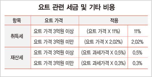 선박 값 외에 세금과 중개 수수료도 따라붙는다. 레저 선박은 취득세 납부 시 중과세 부가 대상 원칙에 따라 3억원 이상인 요트는 11%, 3억원 미만 요트는 2.02%의 세율이 적용된다. 중개 수수료는 업체별로 상이하지만 대개 10% 이상의 수수료를 받는 것으로 알려졌다. 슈퍼 요트의 중개 수수료는 1~2% 선이다.