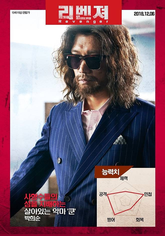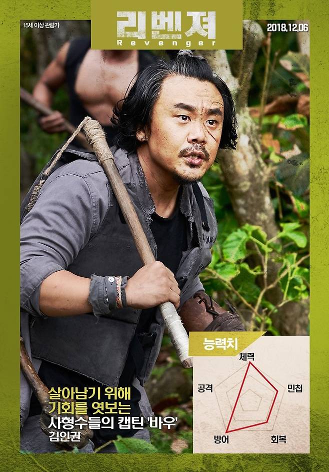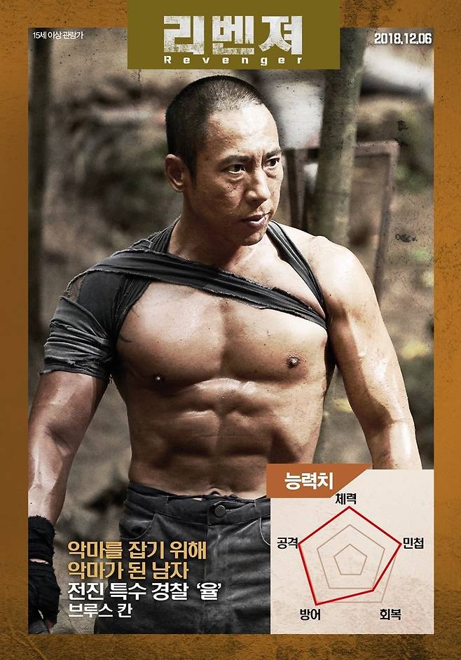 '리벤져'에서 액션 패치를 장착한 브루스 칸, 박희순, 윤진서, 김인권의 ‘액션 능력치’를 확인할 수 있는 캐릭터 포스터가 30일 공개됐다. '리벤져'는 복수를 위해 사형수들의 죽음의 섬 수라도에 찾아온 전직 특수경찰 율(브루스 칸)이 수라도를 지배하는 살아있는 악마 쿤(박희순)을 잡기 위해 악마가 되어 펼치는 서바이벌 액션.