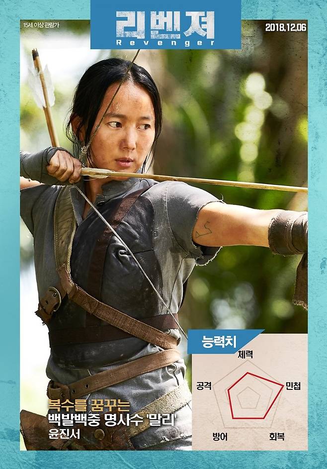 그런 쿤의 ‘액션 능력치’에서 유독 회복과 체력이 약하게 표기돼 있어 관객들의 궁금증을 불러일으킨다. 쿤에게 복수를 꿈꾸는 명사수 말리 역을 맡아 몸을 사리지 않는 역대급 액션 연기로 새로운 매력을 선보인 윤진서는 ‘액션 능력치’에서 민첩이 특히 강하게 표기되어 있어 본편에서의 활약에 대한 기대감을 높인다. 살아남기 위해 기회를 엿보는 사형수들의 캡틴 바우 역의 김인권은 액션에서 가장 중요한 공격이 아주 약하게 표기되어 있는 것에 비해 방어와 체력이 강하게 표기되어 액션 보다는 입담으로 생존 기술을 선택한 캐릭터의 특성을 엿볼 수 있다.