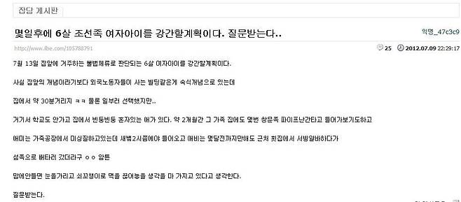 자신의 집 앞에 사는 조선족 어린이를 강간할 계획이라는 글이 올라와 논란이 됐다. 이후 다른 커뮤니티로 공유되며 사건이 널리 알려지자 최초 글 작성자는 글을 삭제했다.