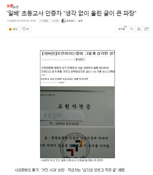 한 초등교사가 일베에 교원자격증을 인증하며 "로린이"라는 단어를 사용. 이는 소아성애를 나타내는 '로리타'와 '어린이'의 합성어로, 글 작성자는 사건이 알려진 이후 임용이 취소됐다.